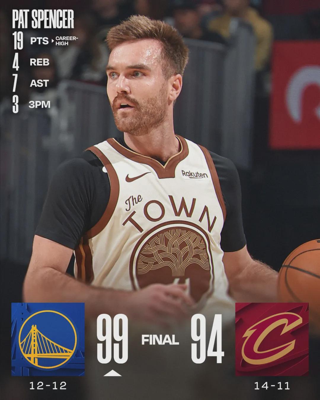 北京时间12月7日,勇士客场99-94击败骑士。勇士这边,库里、巴特勒和追梦都不打,骑士首发阵容少了加莱特-阿伦。勇士双向合同后卫帕特-斯潘塞生涯第一次打首发,12投7中得到19分4篮板7助攻1抢断,得分创造生涯新高。
